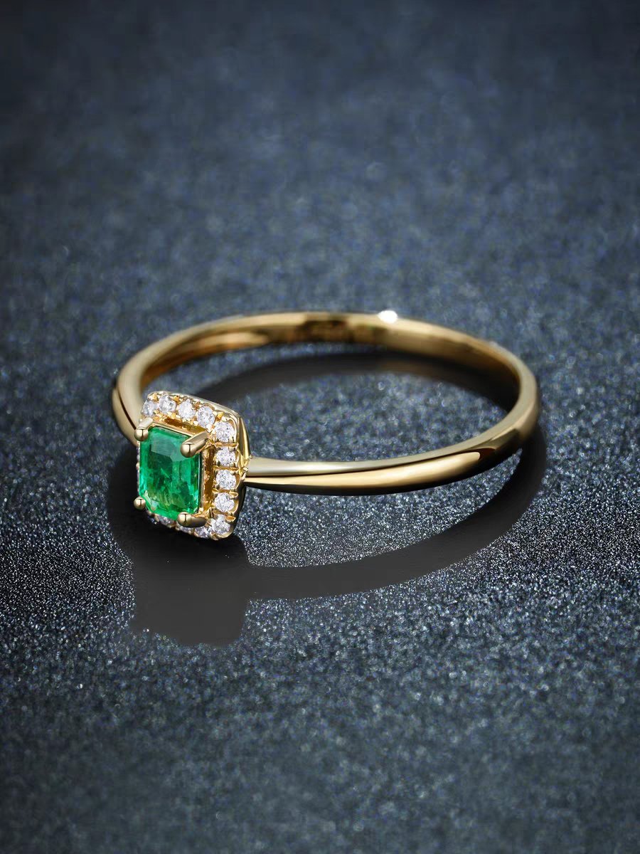 Honestly? This is one of those rings that stops conversations. Not because it’s loud—it’s not. But because the color combination is so unexpected. A 0.3ct Zambia natural Vivid Green emerald at the center, deep and confident. And surrounding it, 16 tiny sparkling VVS2 diamonds that catch light like morning ice. Together, they create something you don’t see every day. Our Emerald Diamond Ring in warm 18K yellow gold—the kind of piece that makes you glance at your own hand just to catch the light again.