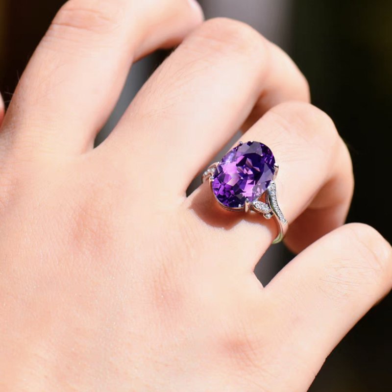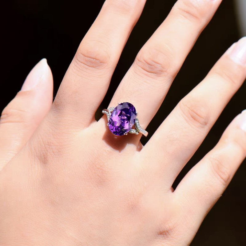 At its center is a 10×14mm oval-cut natural amethyst. The color is a deep, calming purple—the kind you see just before the sky turns dark. We’ve held it in a classic four-prong solitaire setting, so light can move through the stone from every angle, catching those quiet violet flashes.