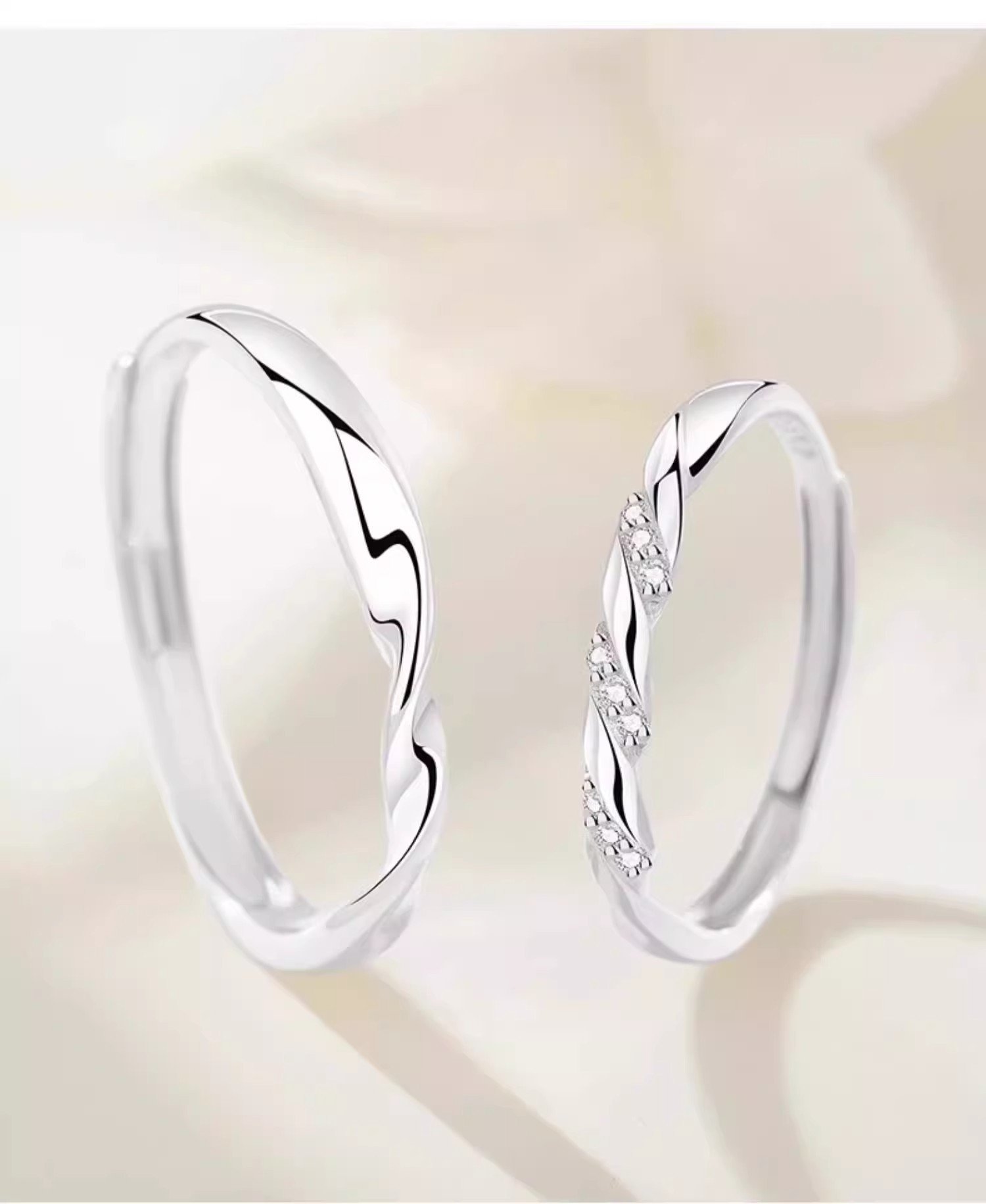 Adjustable Mobius twist couple rings set in 925 sterling silver. Non-tarnish, hypoallergenic, with engraving. Ideal promise rings for everyday wear and gifting.