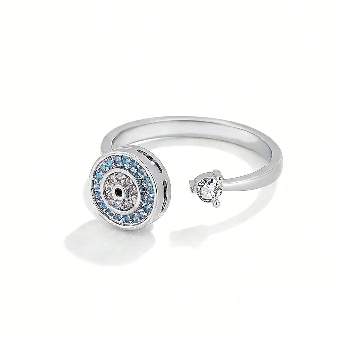 Our Evil Eye Spinning Ring is made from S925 silver with platinum or 18K gold finishes, featuring an open adjustable design, spinning evil eye motif and cubic zirconia accents. Lightweight and unisex, with free global shipping, lifetime warranty, 60-day returns — 25% off now.