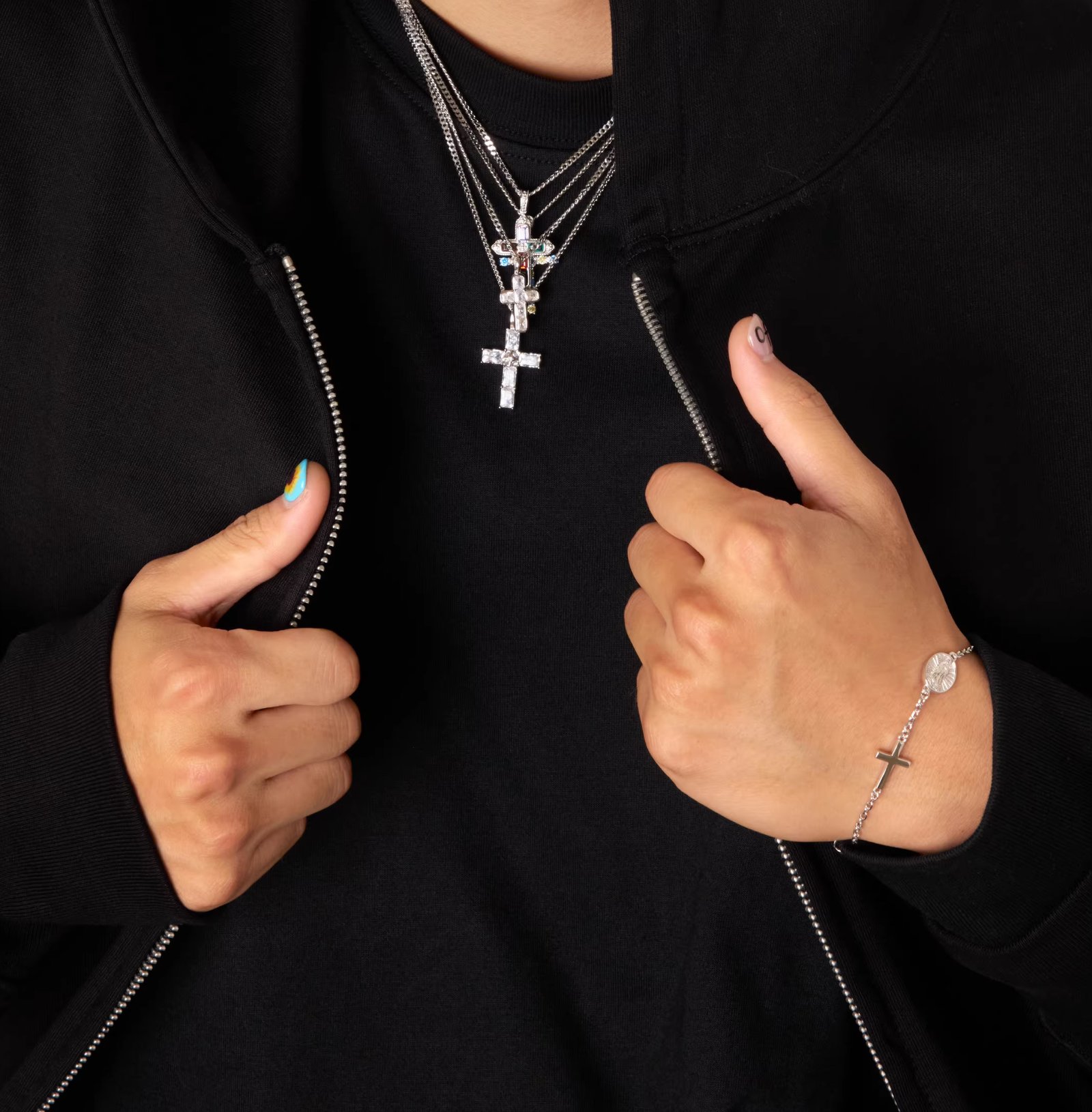 We wanted the two to feel like they belong together. The cross is slim, modern—clean lines, no extra detail. Next to it hangs the Virgin Mary medallion, and this one you’ll want to touch. Run a finger over it and you’ll feel the texture, the tiny relief lines that catch light just slightly. Not enough to sparkle, just enough to know it’s there.