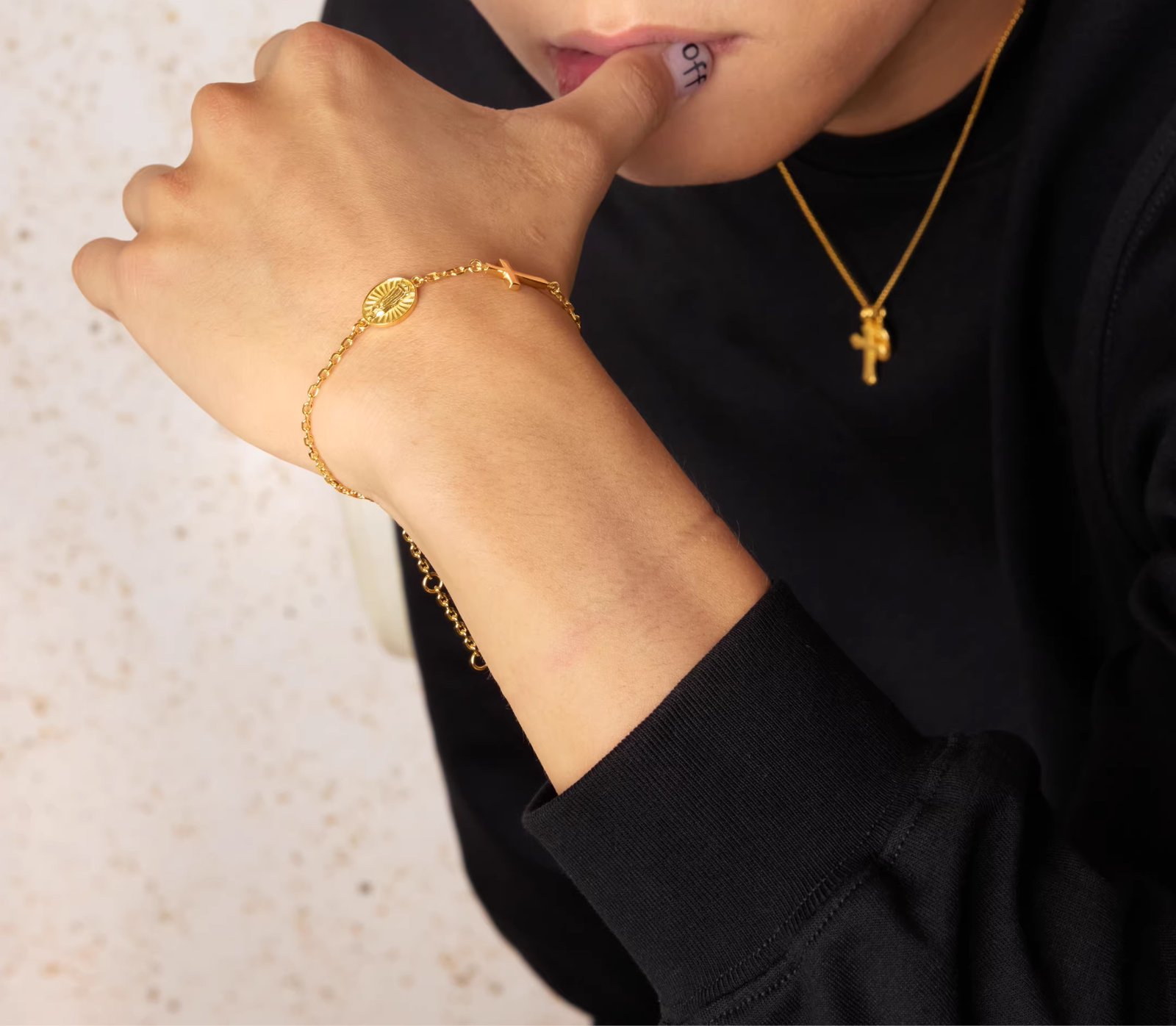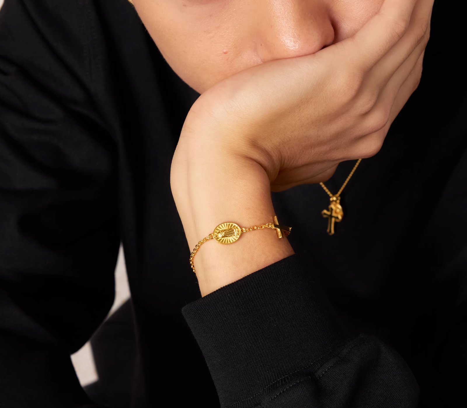 It’s not the kind of religious jewelry that only comes out on Sundays. It’s designed to stay on your wrist through regular days—running errands, sitting at a desk, meeting a friend for coffee. The two charms move separately when you turn your hand, catching your eye now and then.