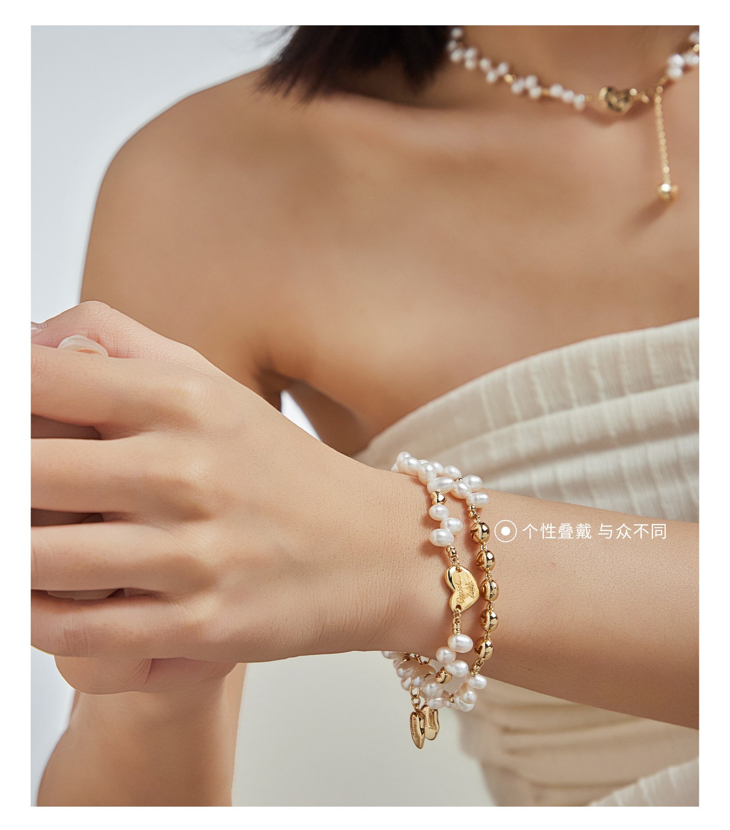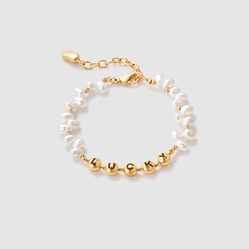 The first time you put on this Lucky Charm Bracelet, you’ll notice the pearls settle right into the hollow of your wrist—not lined up in a stiff row, but scattered irregularly, like tiny drops of luck casually placed. A small heart dangles there, engraved with the word “Lucky.” You catch sight of it every time you glance down. We like to think of it as a little pocket charm you wear—slip it on, and somehow wishes feel a bit closer.
