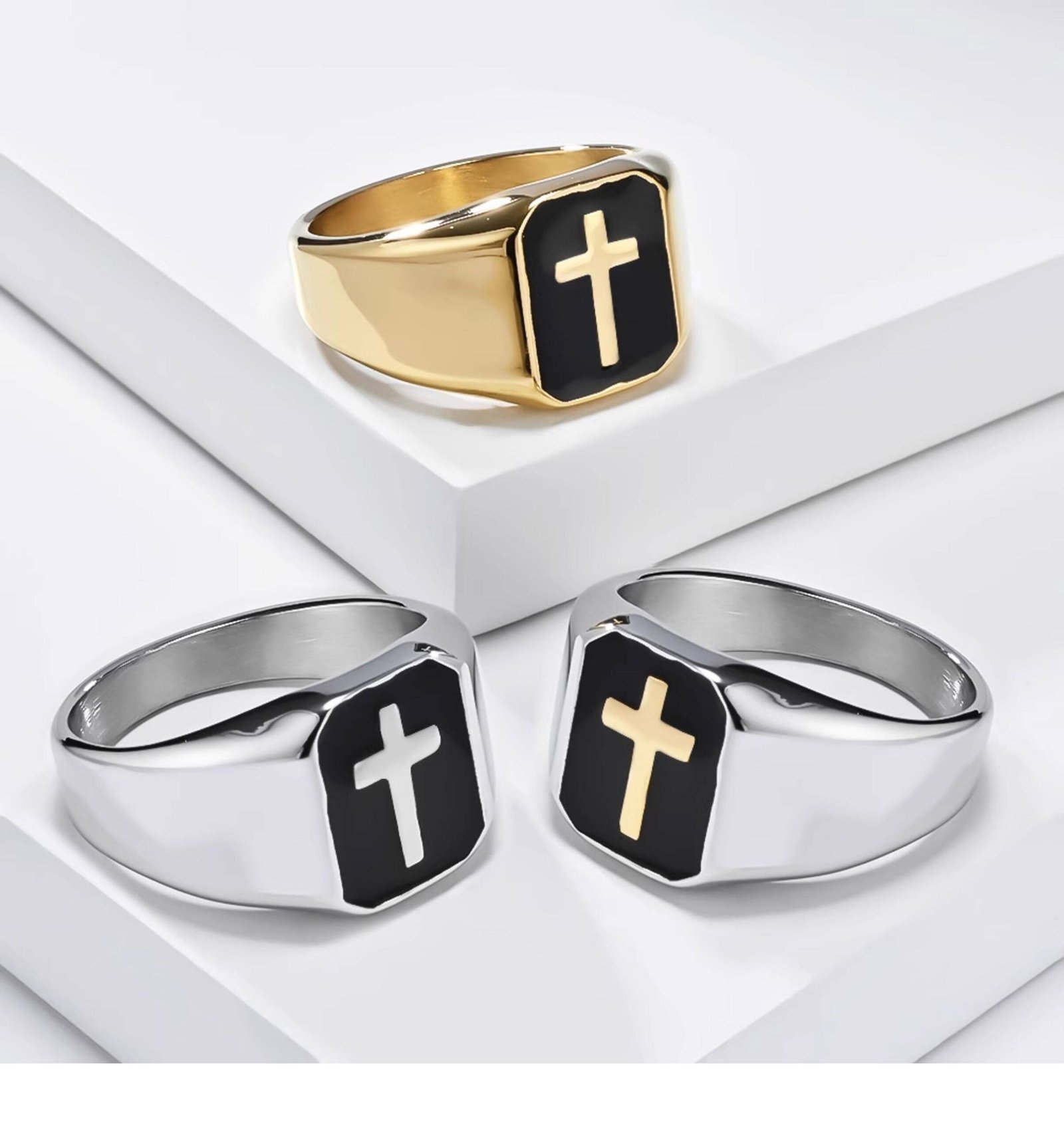 Cross Christian Ring available in silver, gold, and two-tone finishes, titanium steel