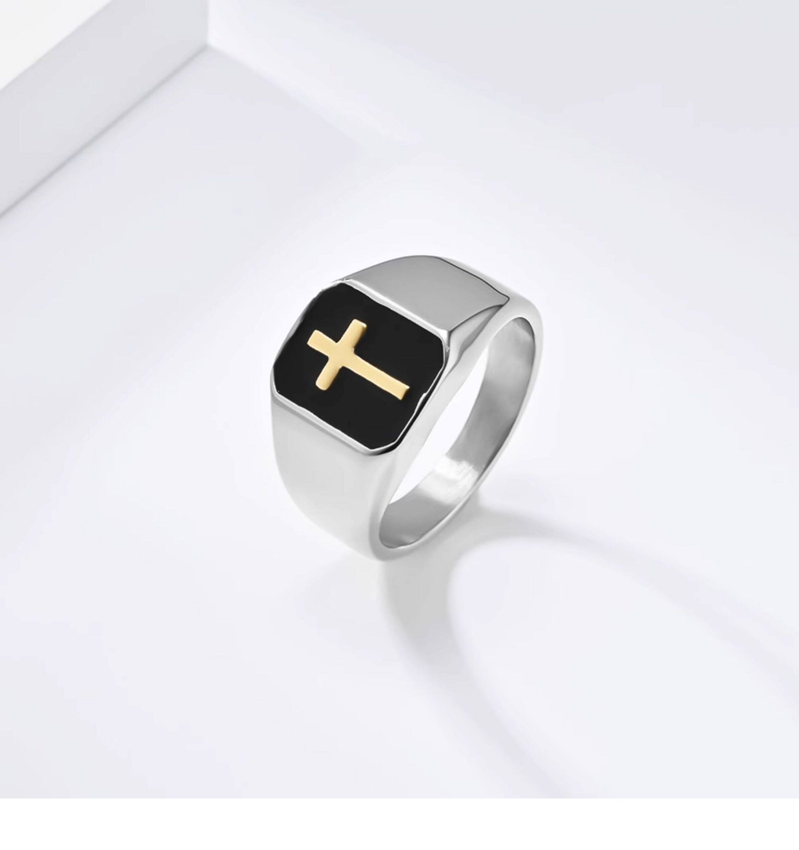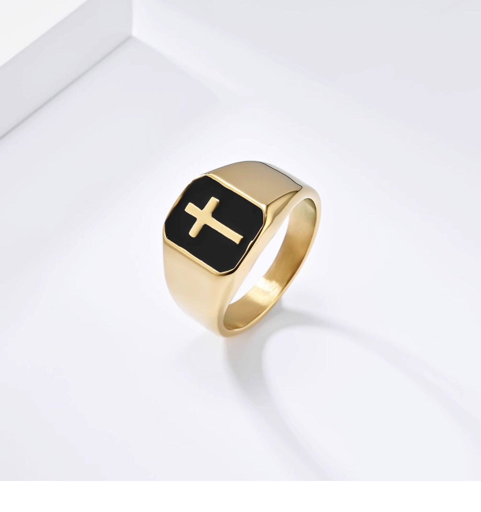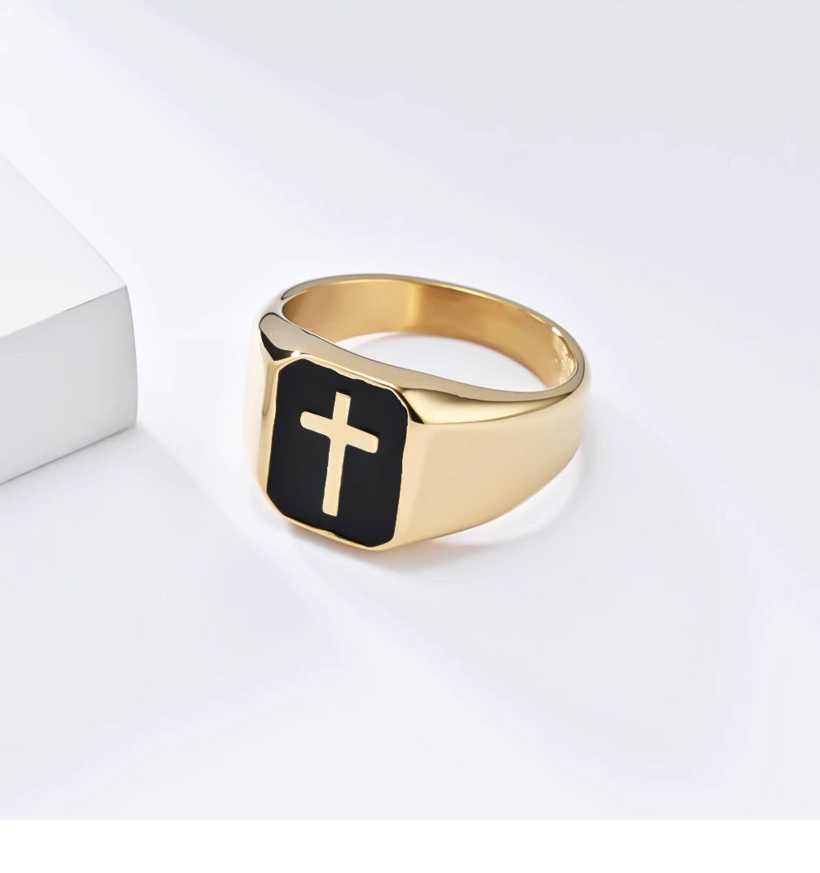 Minimalist Gold Titanium Steel Gold Cross Ring for Men with black enamel, Latin Cross design