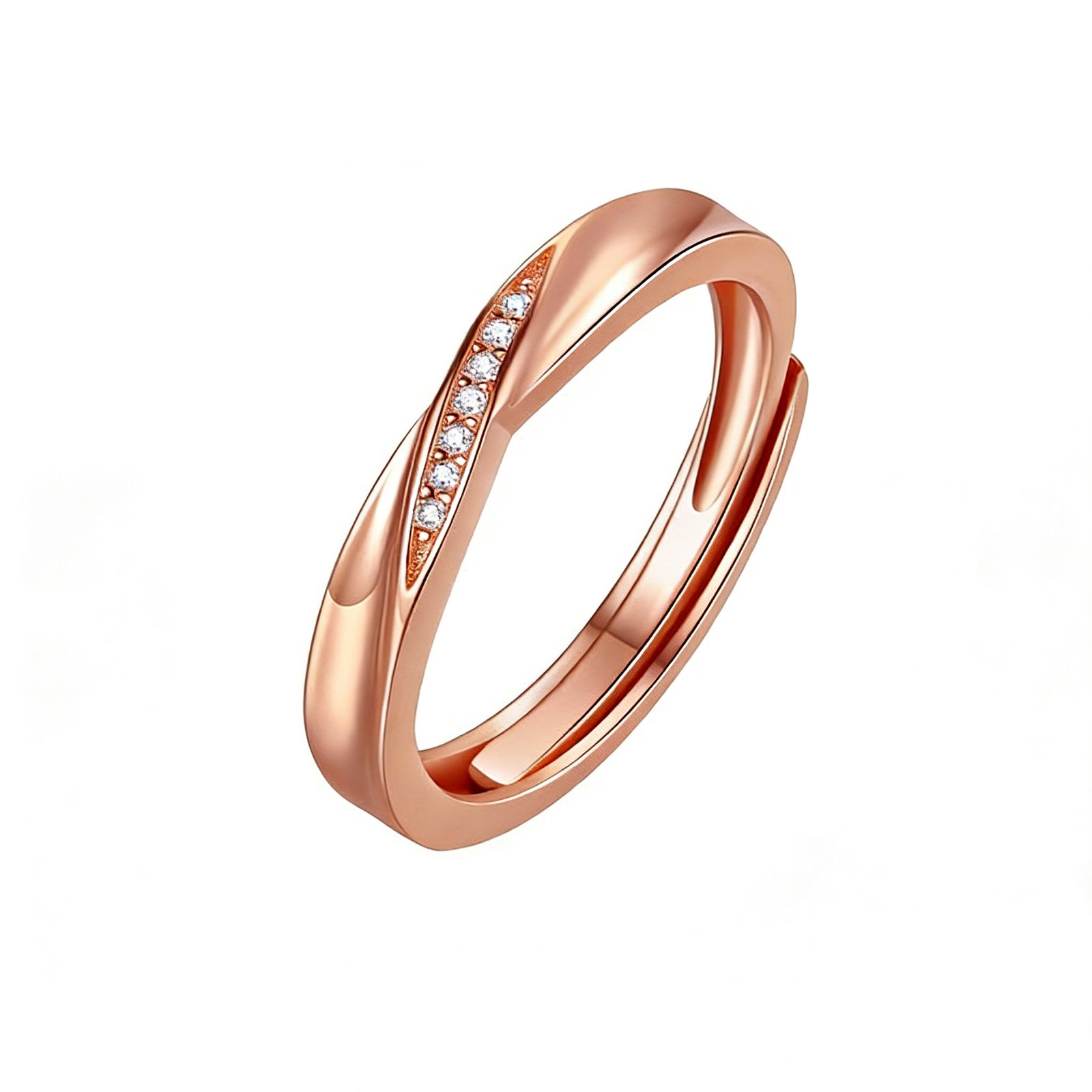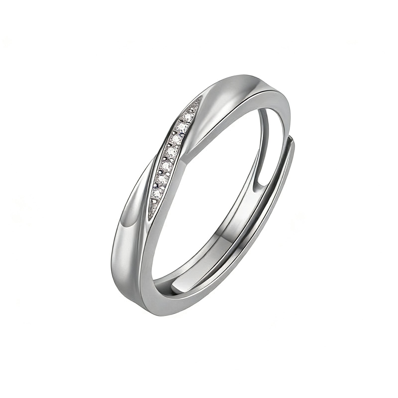 Mobius-inspired S925 silver couple rings with adjustable open band design. Features sparkling CZ stones for her, available in white or rose gold PVD finish. Customizable to 18K gold with natural or lab-grown diamonds. A timeless symbol of infinite love—perfect for promise, engagement, or anniversary.