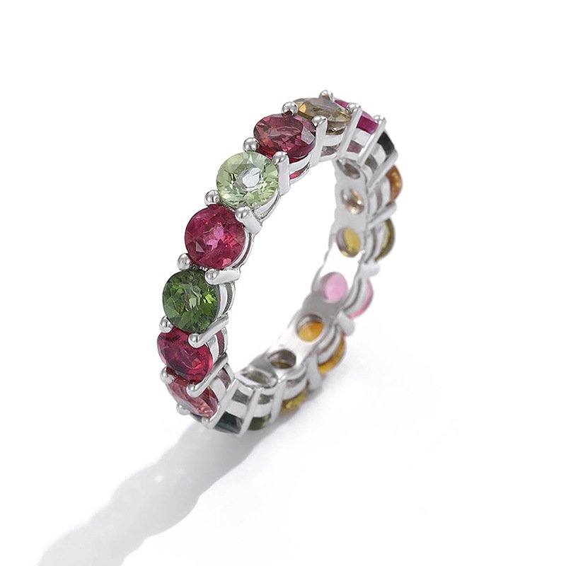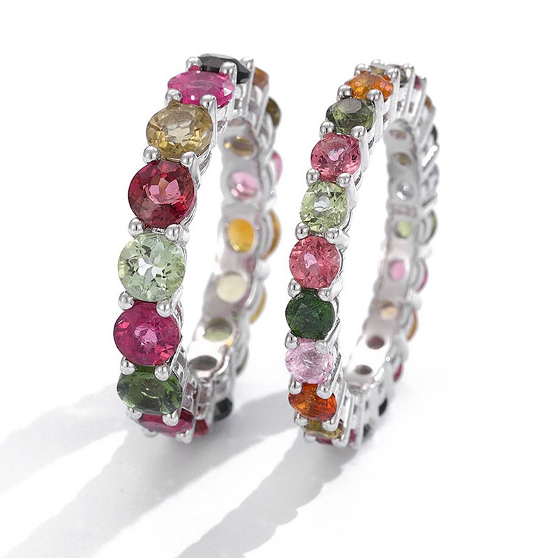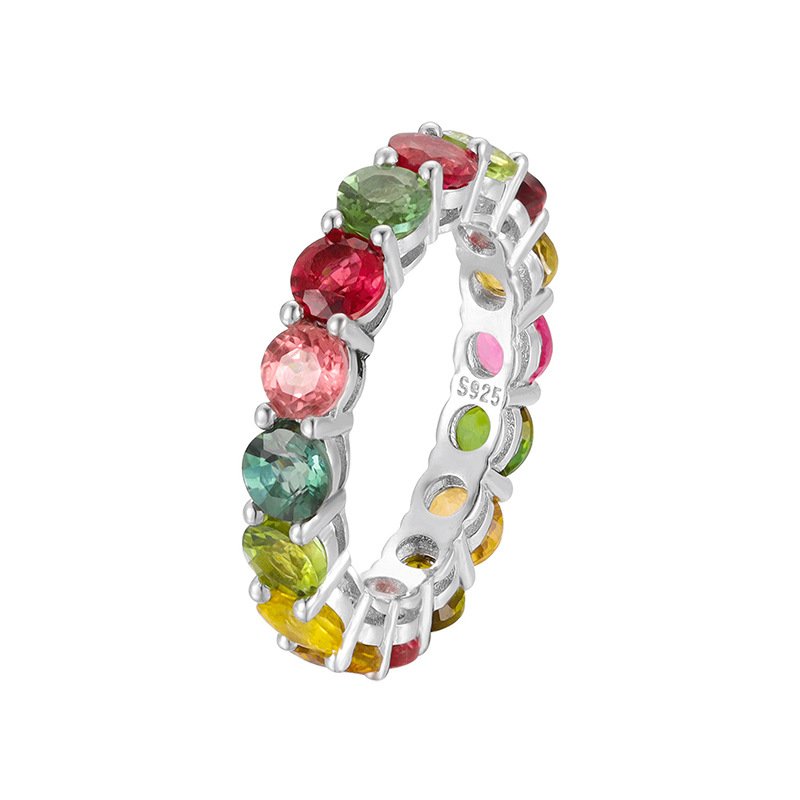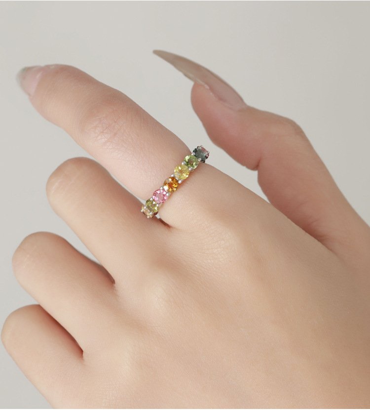 There’s something quietly special about an October birthstone ring for women. Ours is set with natural tourmaline—the month’s official gem, alongside opal. We handcraft it in hypoallergenic 925 sterling silver, so it feels smooth and light on the finger. The ring runs a full row of brilliant round-cut tourmalines. They catch the light in small flashes, like bits of morning sun through a window. You can choose between 3mm or 5mm stones, depending on whether you want something delicate or a bit more present. Either way, it’s an eternity band that works alone or stacked with others.