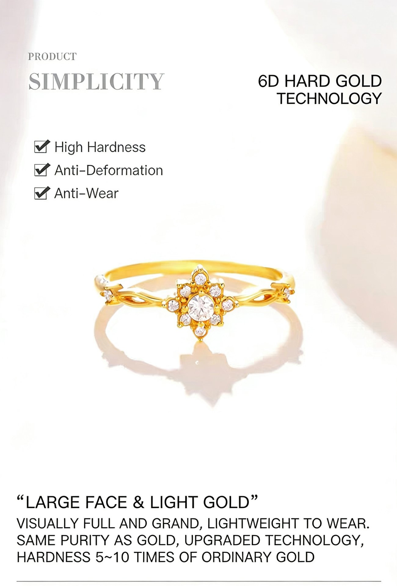 This 0.55g-0.65g delicate sunflower moissanite gold ring is made of pure gold. It’s a sweet gift for girlfriend, mom, and can be used for simple proposal.