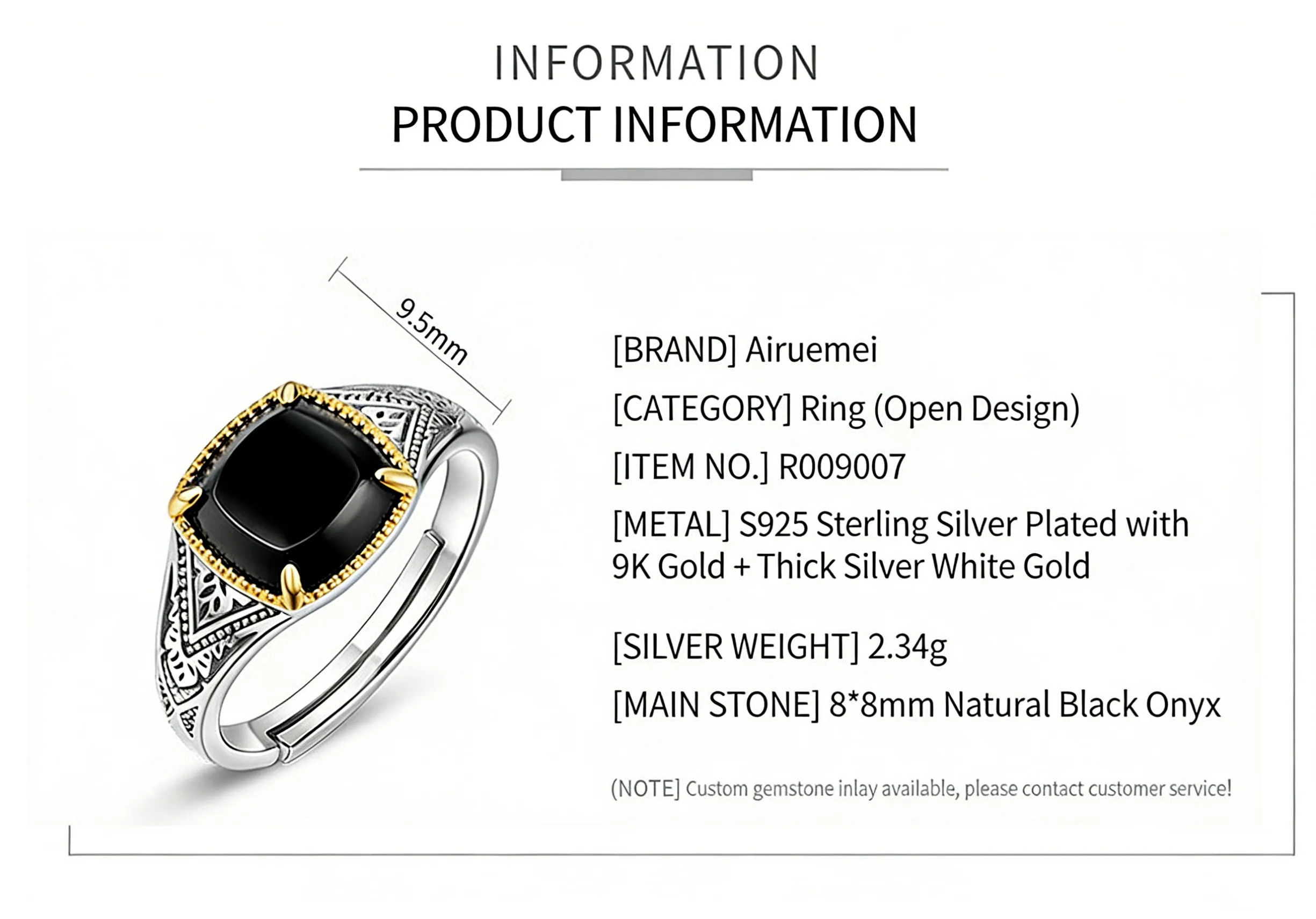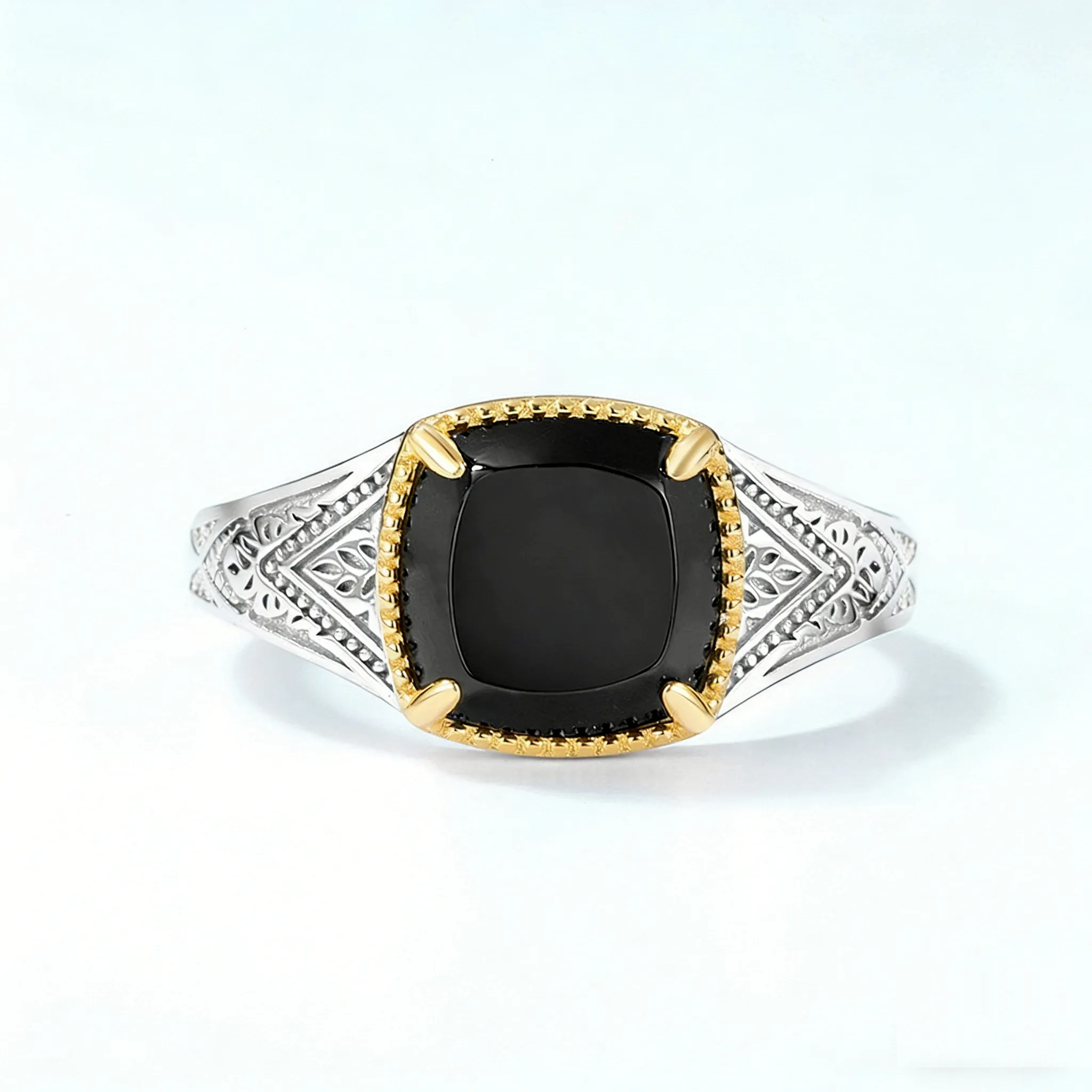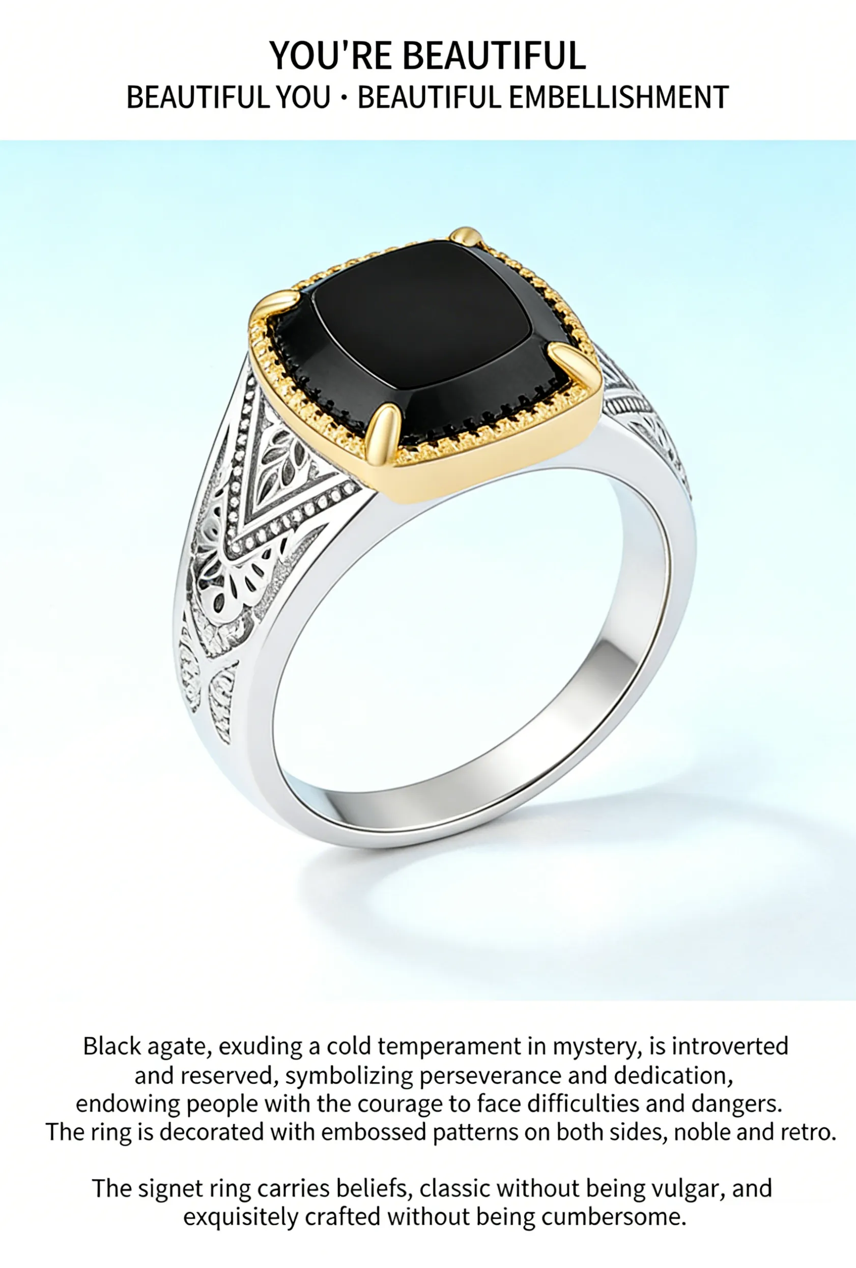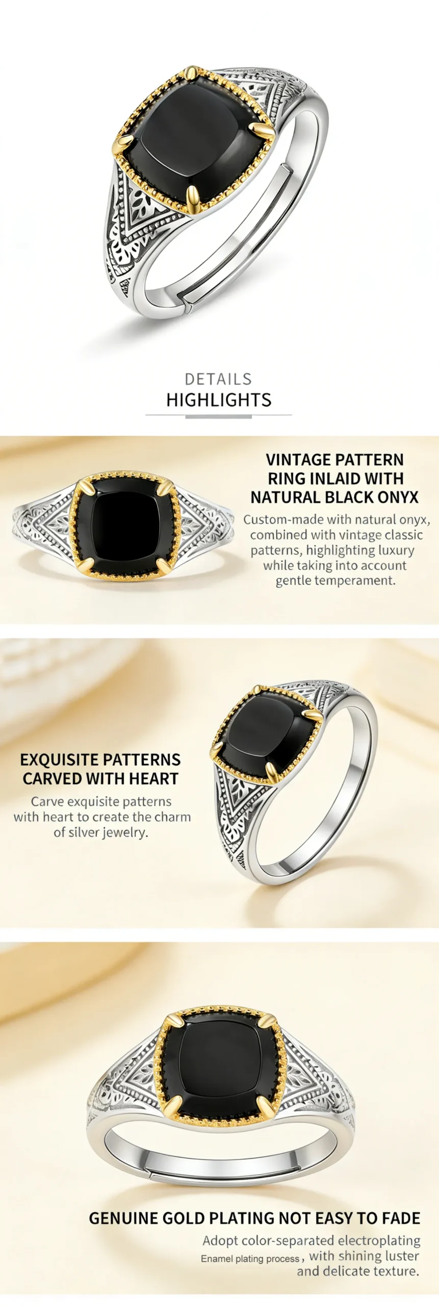 This black onyx signet ring is a timeless vintage piece designed exclusively for women, combining classic aesthetics with modern practicality. Made from genuine S925 sterling silver, it features delicate classical pattern engravings that highlight retro elegance and artisanal detail. The center stone is held securely by a precise prong setting, showcasing the deep luster of natural black onyx. For versatile styling, you may also choose green moss agate as an alternative center stone, perfect for those who love unique natural gemstone jewelry.