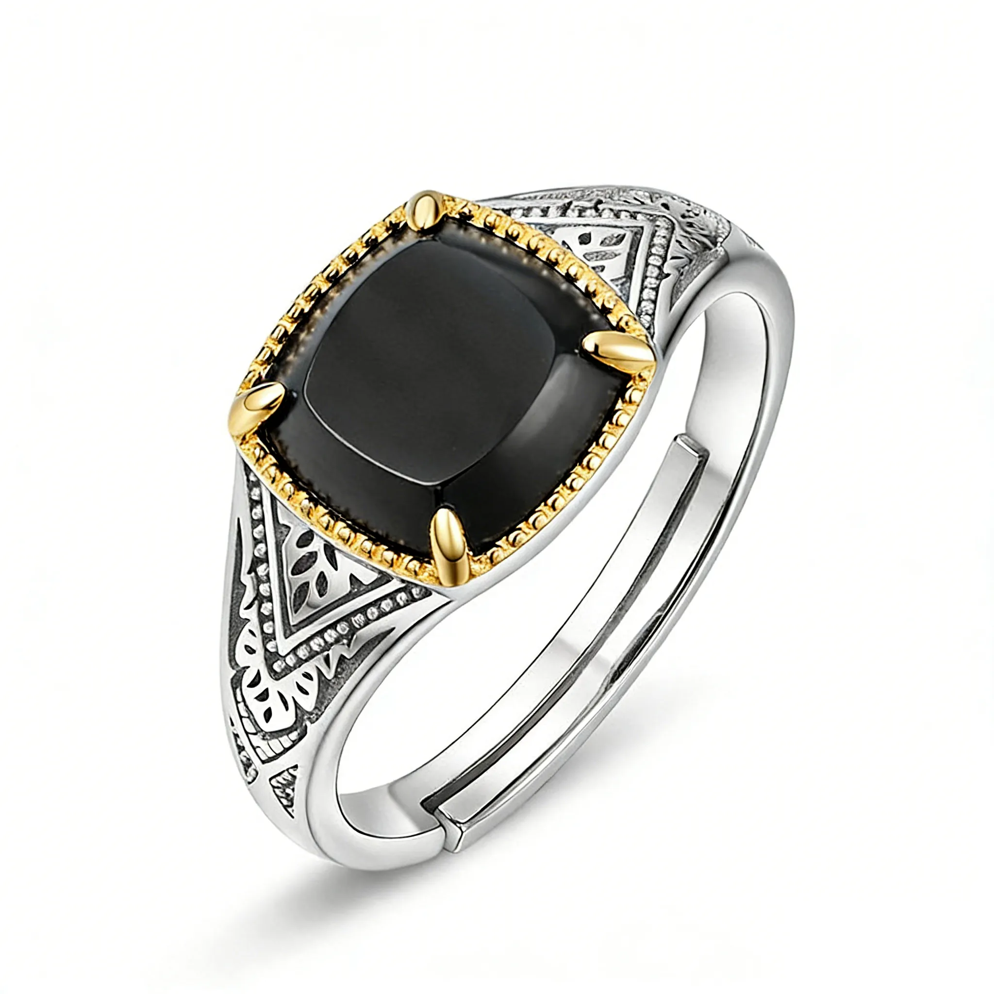 Vintage black onyx signet ring or green moss agate band crafted in S925 silver with classical patterns, prong setting, adjustable open band. Optional green moss agate, lifetime warranty, 60-day returns, 30% off.