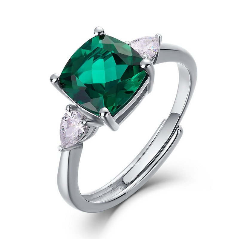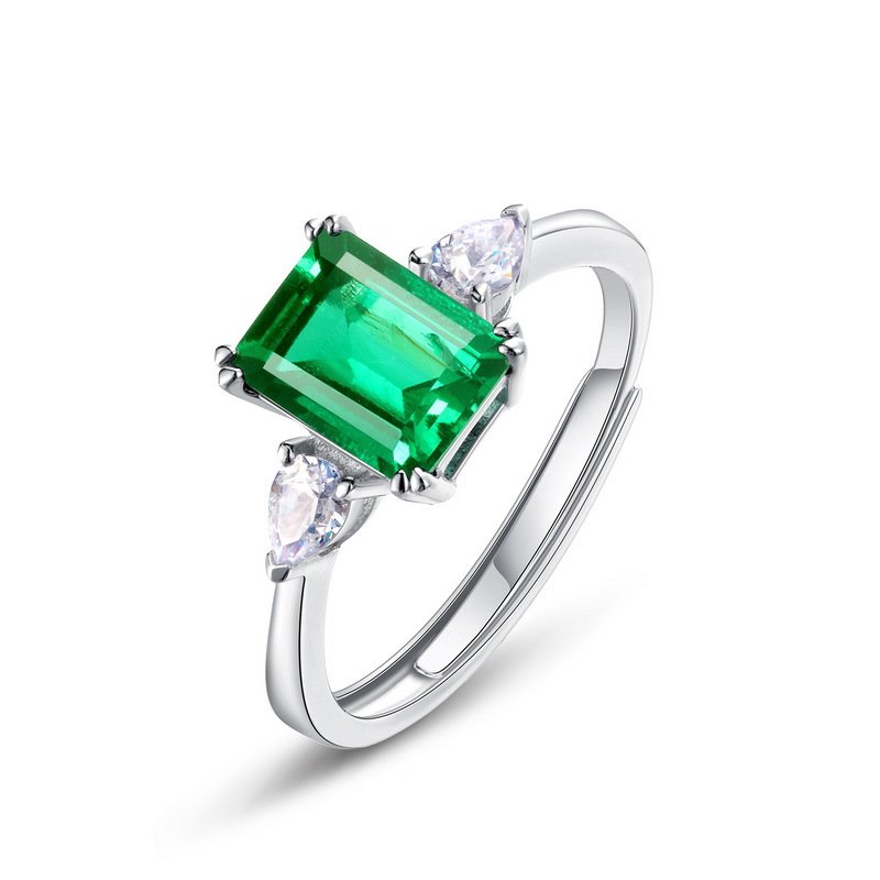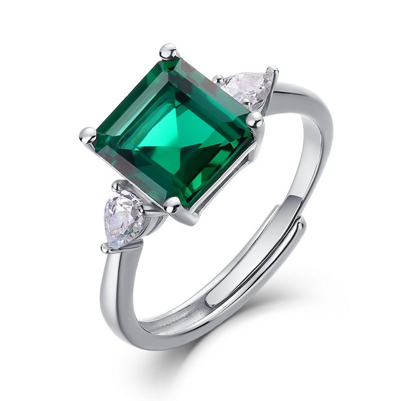 This minimalist S925 silver princess cut lab grown emerald ring features white gold plating, cubic zirconia accents, and an open adjustable band—perfect for everyday wear or thoughtful gifting.